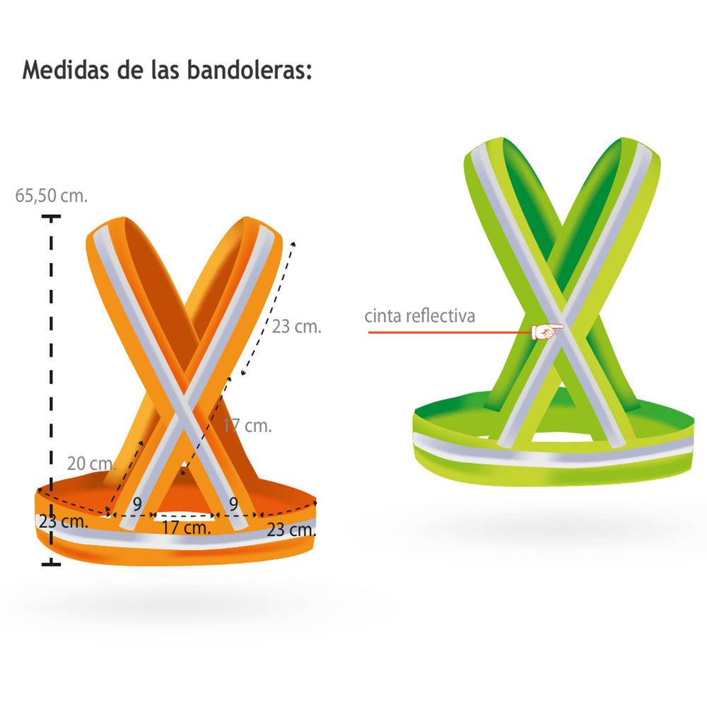 - La bandolera construida en cinta poliester fluorescente cuenta con una banda continua de reflectivo aplicada en todo el recorrido de la cinta.