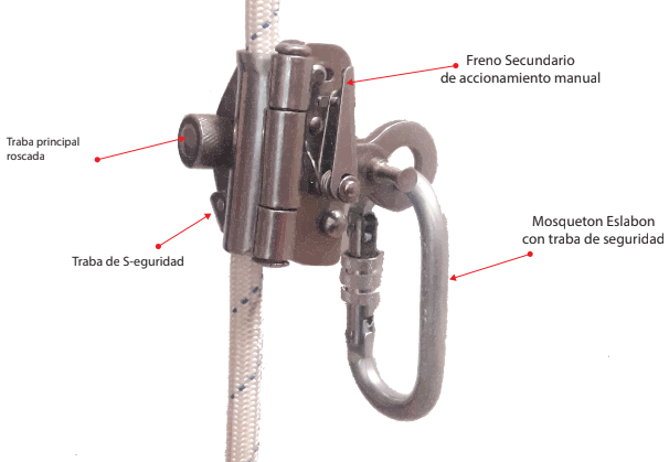 Posee un sistema de freno secundario de accionamiento manual que permite reducir al máximo la distancia de caída, brindando máxima seguridad al operario.