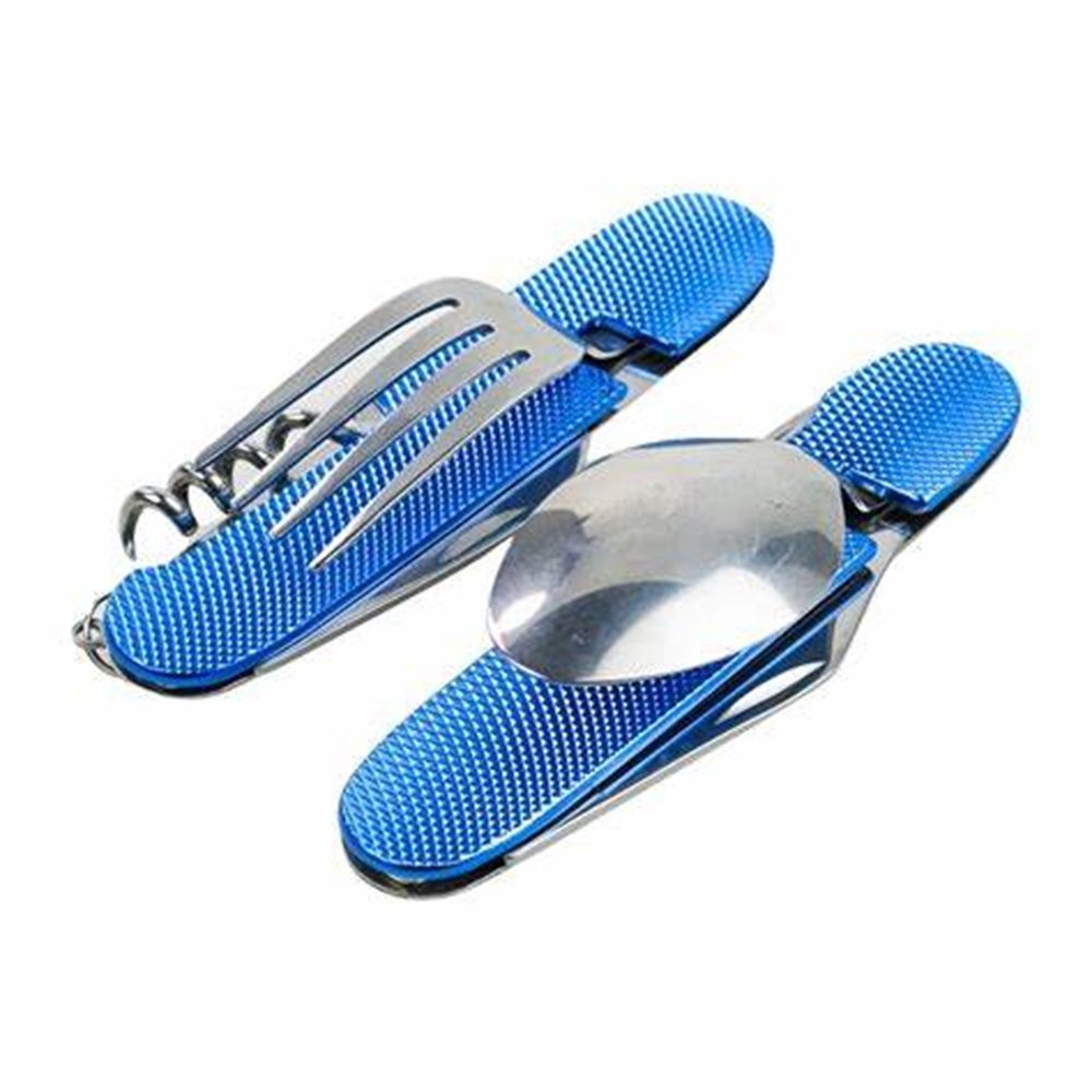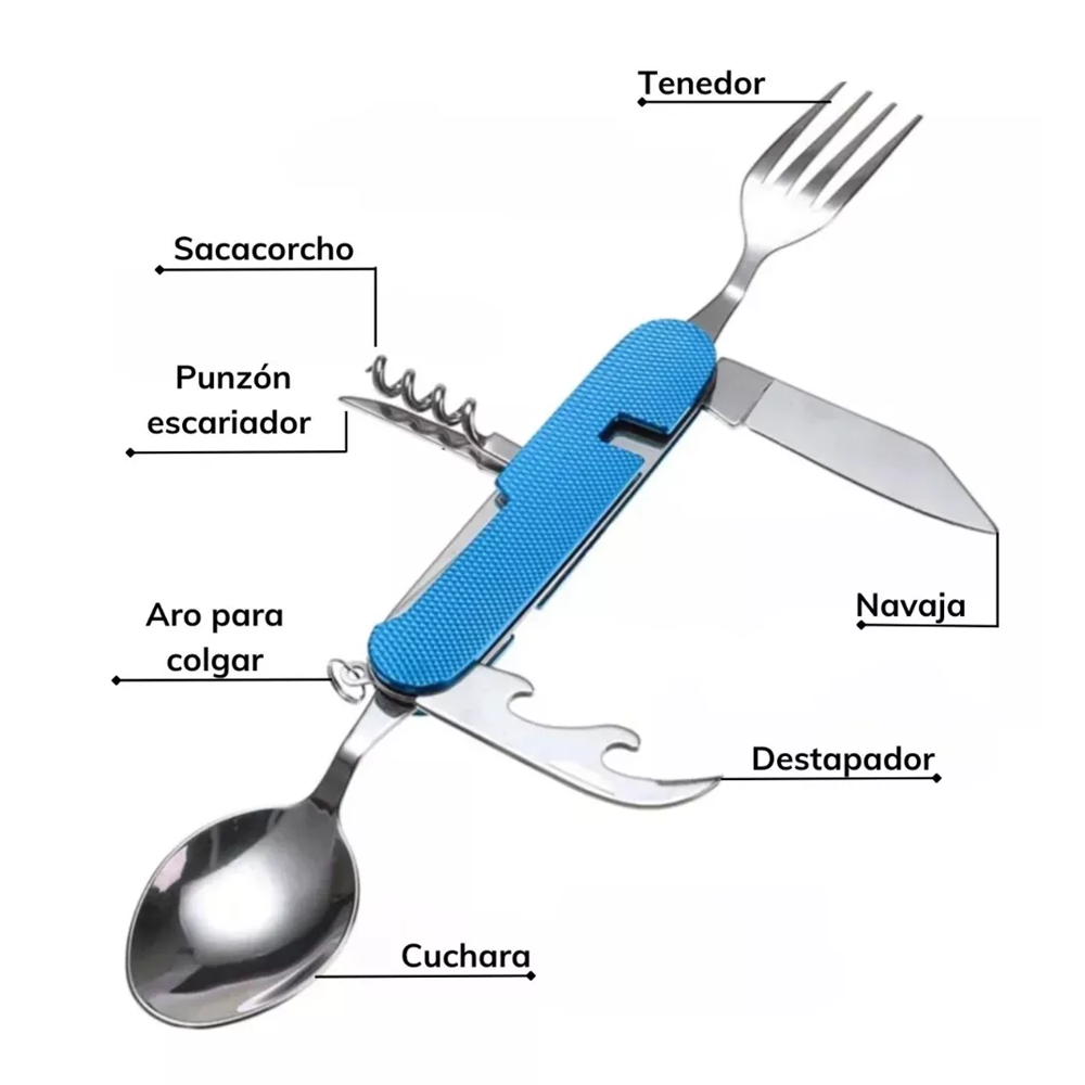 - 1- Cuchillo, 2- Tenedor, 3- Punzón, 4- Sacacorchos, 5- Llavero, 6- Cuchara, 7- Abrelatas, 8- Destapador