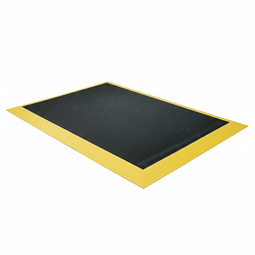 Utilidad: Amortigua los golpes sobre las articulaciones de personas que trabajan de pié, reduciendo el cansancio y el desgaste de las articulaciones. Además aísla al operario de vibraciones molestas y es un eficaz aislante eléctrico y térmico. La superficie posee un grabado antideslizante. Modo de uso: Se debe instalar con el lado liso (negro) hacia arriba cubriendo la zona de movimiento del operario. Los bordes amarillos deben orientarse en el sentido de ingreso del operario al tapete. No es indispensable fijarlo al piso, excepto en pisos muy húmedos.